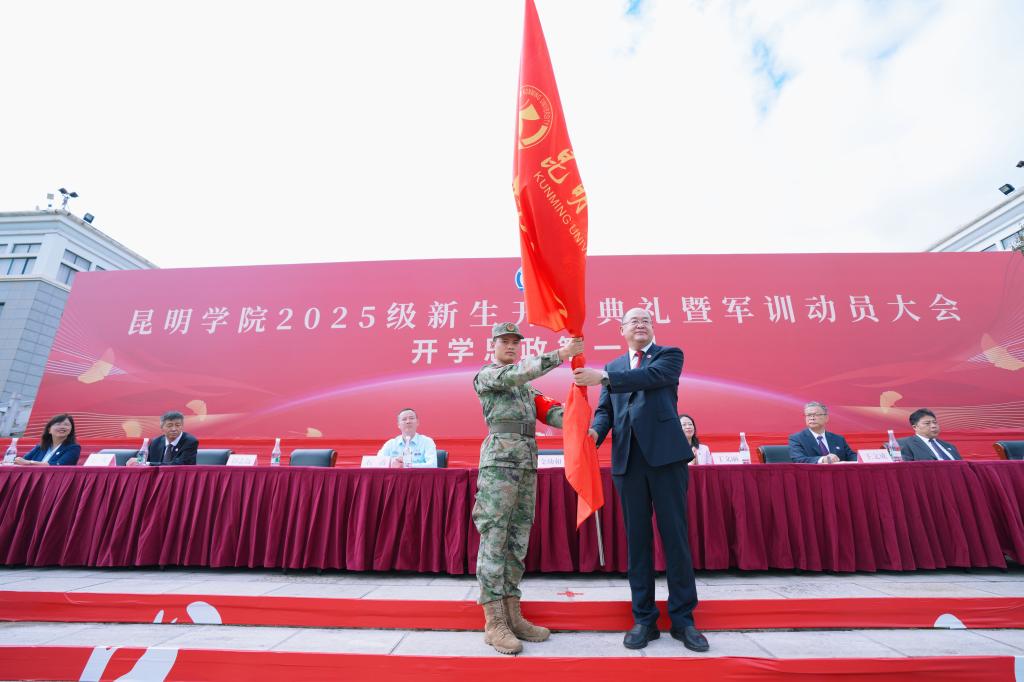 金幼和为beat365英国官网网站2025级新生军训团授旗,军训团团长接旗。