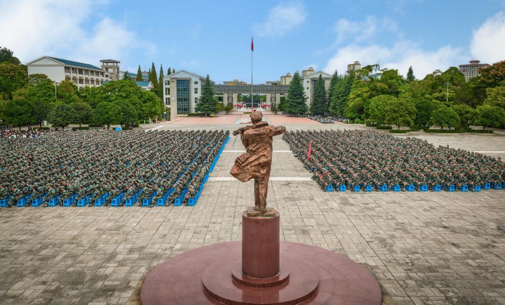 全体新生在军训教官的带领下在聂耳广场整齐就座。上午9时,开学典礼正式拉开序幕,全场师生面向国旗行注目礼,唱国歌。