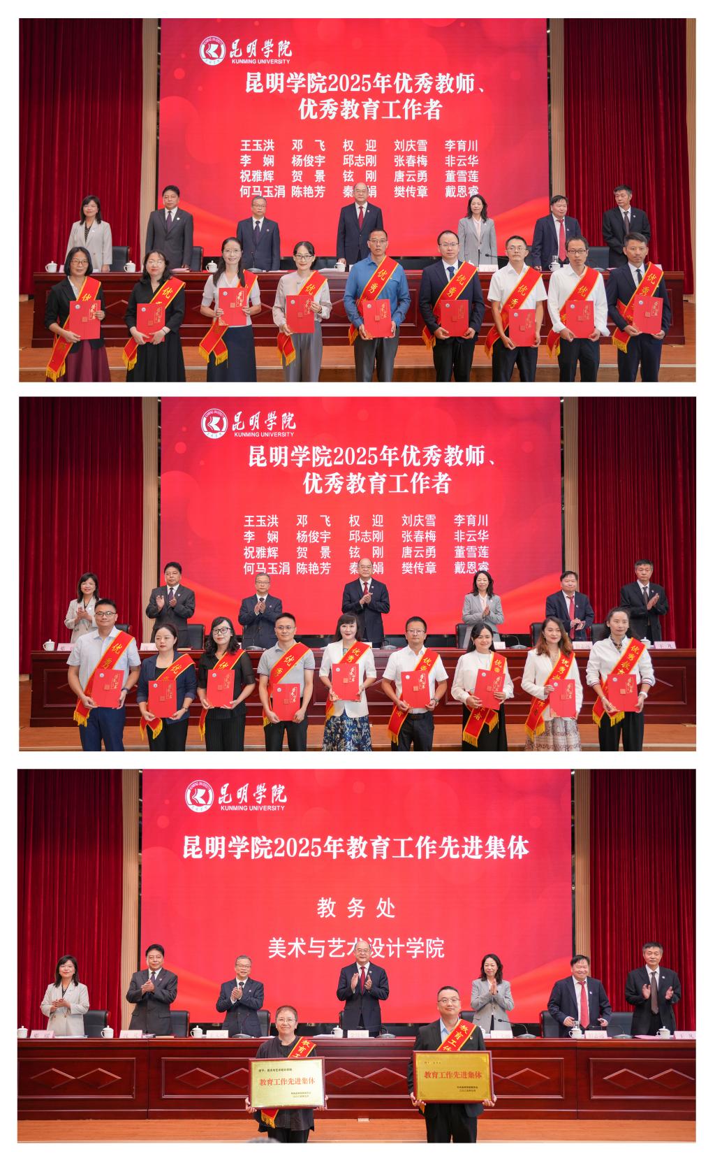 金幼和表示,近年来,学校党委高度重视教师队伍建设,坚持实施“人才强校”战略,落实师德师风第一标准要求,以教育家精神铸魂强师行动为引领,全面实施“立德”“引育”“培优”“团队”“改革”五大工程,教师队伍素质整体得到明显提升,涌现出云南省“兴滇英才支持计划”、昆明市“春城人才计划”等各级各类人才168人次,接连获评“全国模范教师”“云南省最美教师”“云南省优秀教师”“云南省最美高校辅导员”“云南省最美高校班主任”等8人,“云南省教育工作先进集体”“云南省高校黄大年式教师团队”等2个。今天表先进集体和先进个人是全校教师队伍的优秀代表,为我们树立了榜样,希望全校教职员工向先进典型学习,时时以习近平总书记提出的“四有好老师”“四个引路人”和“四个相统一”标准来严格审视自己,大力弘扬践行教育家精神,潜心治学、悉心育人,做让党放心、让人民满意的好老师。
