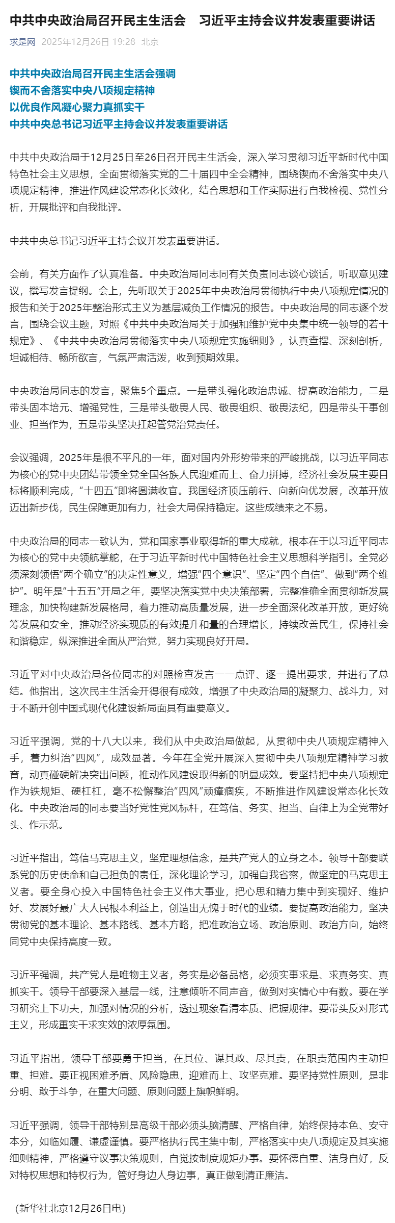中共中央政治局召开民主生活会 习近平主持会议并发表重要讲话