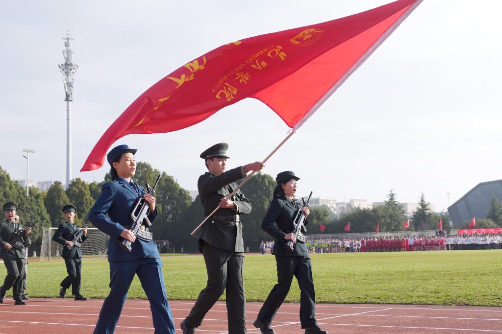 铿锵有力的旋律在耳畔回荡,国旗班、红旗队、裁判员代表、各二级学院、易班等方阵精神抖擞、热情高涨,踏着坚定的步履先后入场。