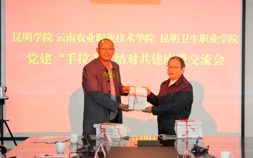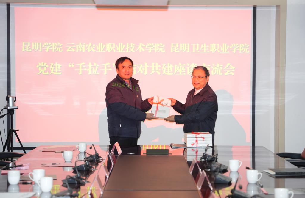 党委副书记王文成代表学校向云南农业职业技术学院、昆明卫生职业学院赠送了《beat365英国官网网站校史》