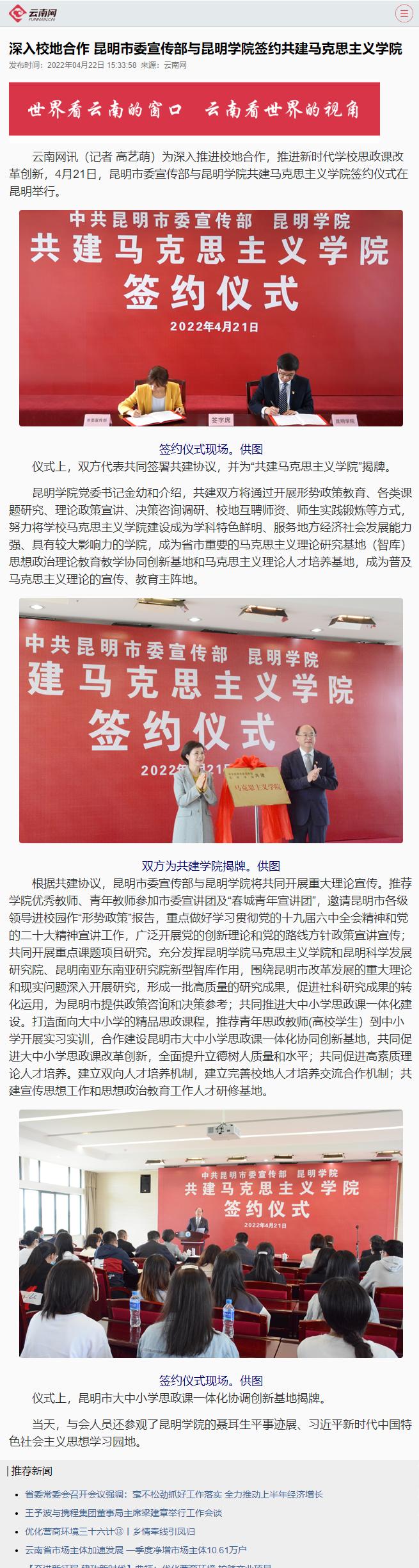 深入校地合作 昆明市委宣传部与beat365英国官网网站签约共建马克思主义学院