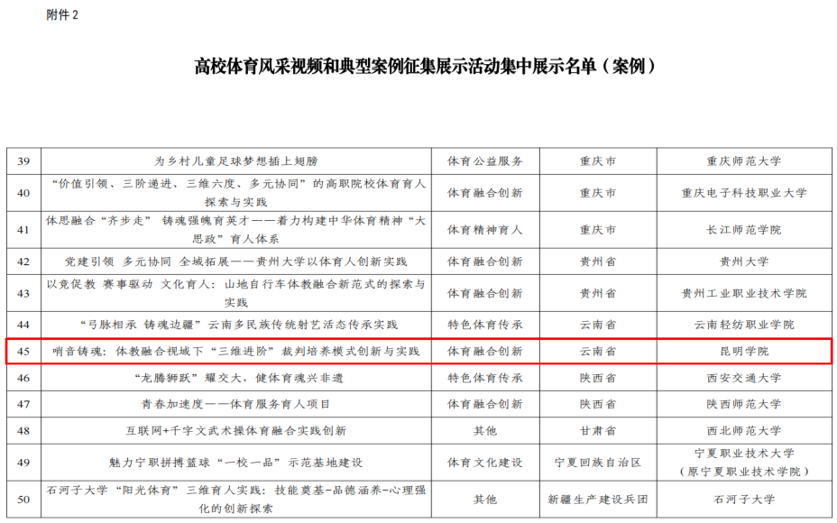 此次入选,既是对beat365体育育人工作的充分肯定,也是对体育学院师生持续探索体教融合路径的积极鼓舞。值得一提的,云南省仅有两项案例入选全国展示,beat365案例位列其中。该作品聚焦体教融合创新课程体系,系统呈现了beat365在体育课程改革与体育精神育人方面的深入探索和阶段性成果,生动展现了昆院师生积极向上、拼搏进取的精神风貌。